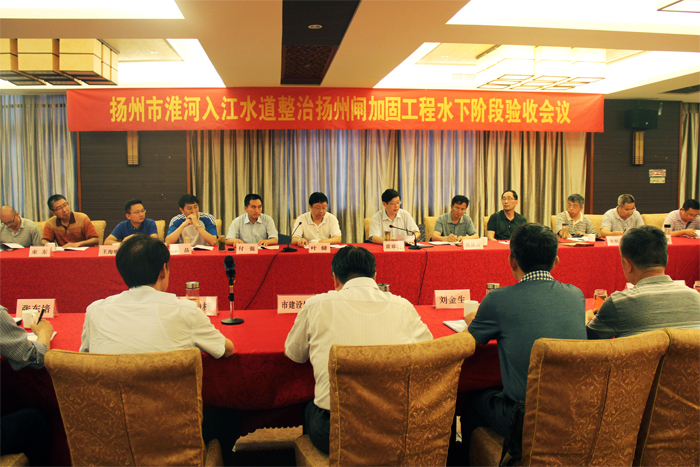 17日上午,葉健副廳長及驗(yàn)收委員會成員冒雨察看了工程現(xiàn)場。下午召開了驗(yàn)收會議。驗(yàn)收委員會觀看了工程建設(shè)專題片,查閱了工程建設(shè)資料,聽取工程建設(shè)、設(shè)計(jì)、施工、監(jiān)理、設(shè)備供應(yīng)等單位的工作報(bào)告,聽取了質(zhì)量檢測單位的檢測報(bào)告、質(zhì)量監(jiān)督部門的質(zhì)量評價意見和專家技術(shù)檢查報(bào)告,認(rèn)為淮河入江水道整治揚(yáng)州閘加固工程水下工程已按批復(fù)設(shè)計(jì)內(nèi)容實(shí)施完成,工程質(zhì)量滿足設(shè)計(jì)和規(guī)范要求,工程資料基本齊全,同意質(zhì)量監(jiān)督機(jī)構(gòu)的質(zhì)量評價意見,驗(yàn)收委員會一致同意淮河入江水道整治揚(yáng)州閘加固工程通過水下階段驗(yàn)收。