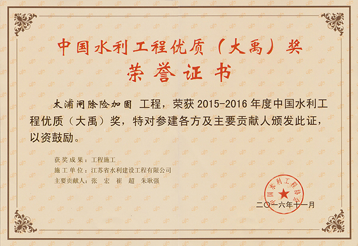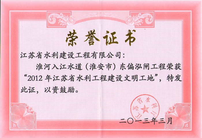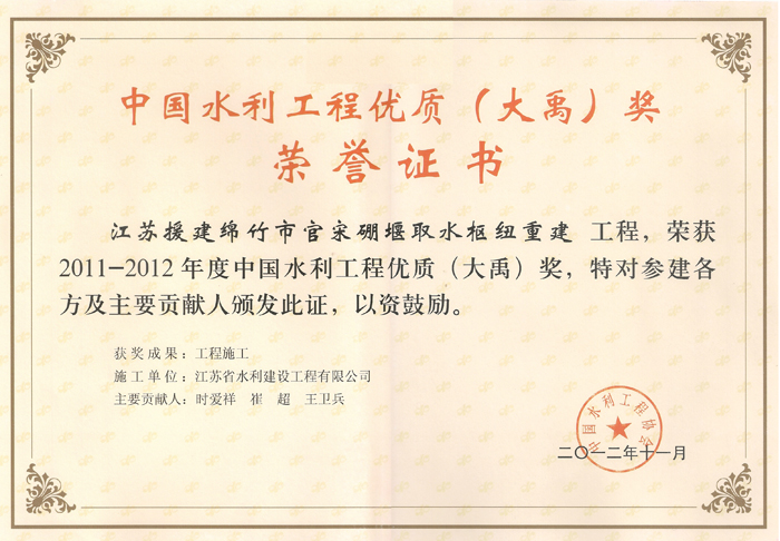 公司連續多年被評為全國水利建設先進集體、全國優秀水利企業、全國安全生產和質量管理先進單位、江蘇省文明單位、建筑業百強企業,榮獲江蘇省“五一勞動獎章”。