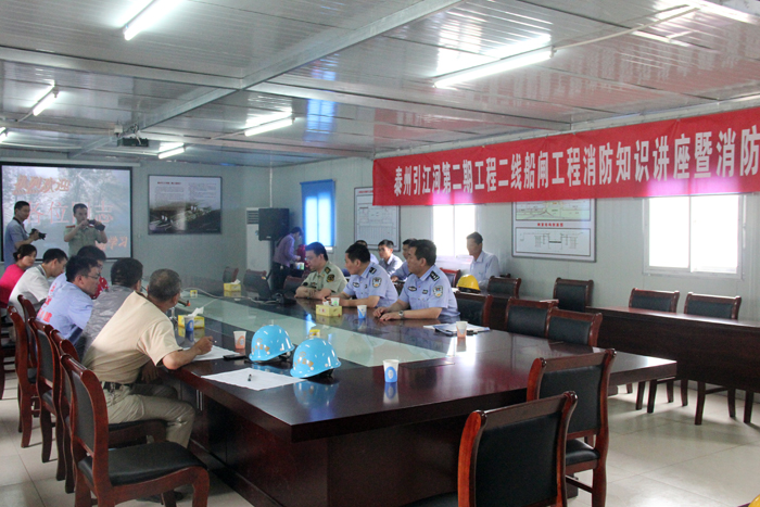 消防講座由泰州消防支隊水上大隊大隊長陳虎主講。他首先介紹了全國消防安全形勢,強調了加強消防工作的必要性。接著分析了近年來各地發生火災的事故情況,用殘酷的事實、真實的數據和圖片資料讓員工們認識到消防安全的重要性和火災發生的危害性。他深入講解了火災發生的特征、火災的種類、滅火器的種類、適用范圍和使用方法等,并結合工程特點介紹了建筑施工消防安全法律法規和施工現場、生活辦公區消防安全知識。泰州市公安局水警支隊高港大隊大隊長黃飛、副大隊長王小鋒分別介紹了引江河二期工程施工現場周邊區域的治安情況,指出了項目部治安工作要點,講解了施工現場危險品儲存、電器、電焊設施安全使用保管等知識。最后進行了現場知識解答。