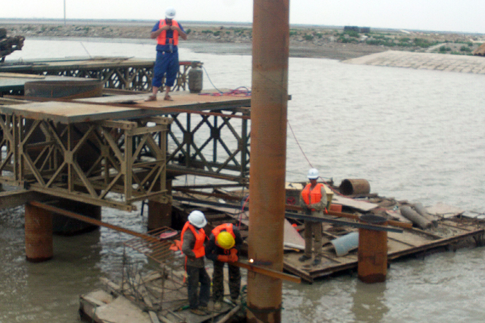 我公司承建的新城閘交通橋工程是連云港市海濱大道工程的重要組織部分,位于市區段西北端,我公司新建的新城閘上游側。跨徑180m,單孔跨度30m,橋寬26m。上部結構為預應力混凝土組合箱梁,下部結構為樁柱式墩臺,鉆孔灌注樁基礎。按照連云港市政府關于加快推進2013年“一號工程”海濱大道建設的工作要求,新城閘交通橋必須保證今年貫通,施工工期緊,任務相當繁重。工程開工時已臨近汛期。為保證安全度汛,項目部采用搭設鋼便橋和水上施工平臺的方案取代傳統的圍堰截流方式,進行水下灌注樁施工。目前東岸鋼便橋已基本完成,4#橋墩樁基鋼護筒已經就位,鉆機平臺正在加固。