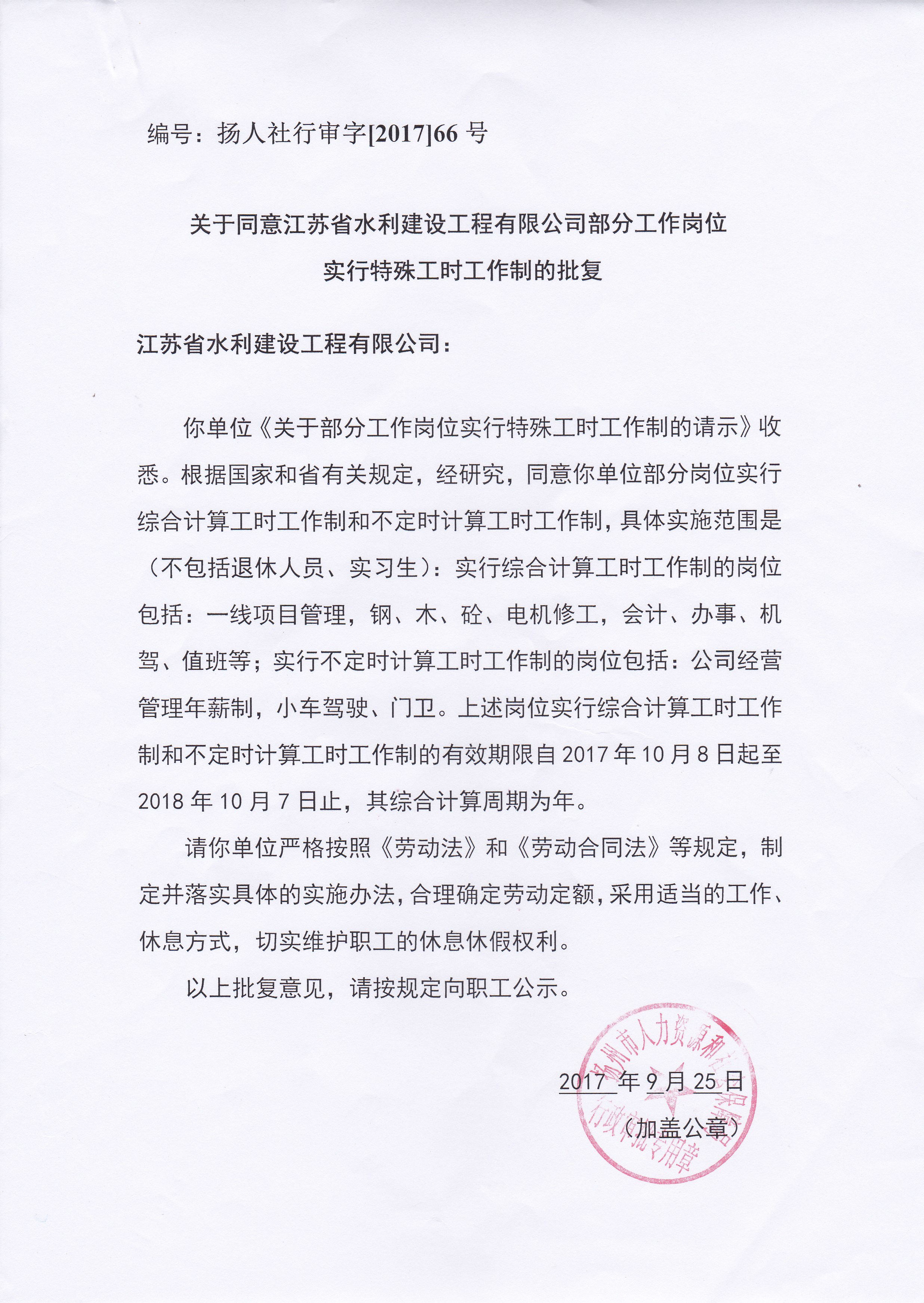 關于同意江蘇省水利建設工程有限公司部分工作崗位實行特殊工時工作制的批復