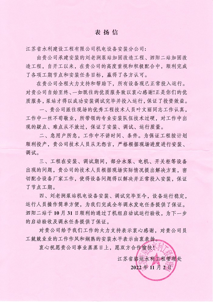 11月2日,江蘇省駱運水利工程管理處發來《表揚信》,對機安分公司承建的劉老澗泵站加固改造工程、泗陽二站加固改造工程順利完成工期節點和安裝任務目標給予高度評價,表揚了公司安裝技術人員特別是葉文麗同志的出色表現,向公司表示感謝和祝愿。