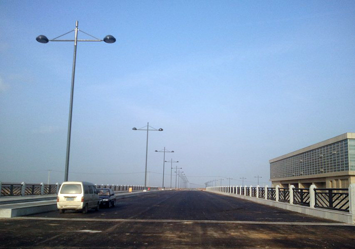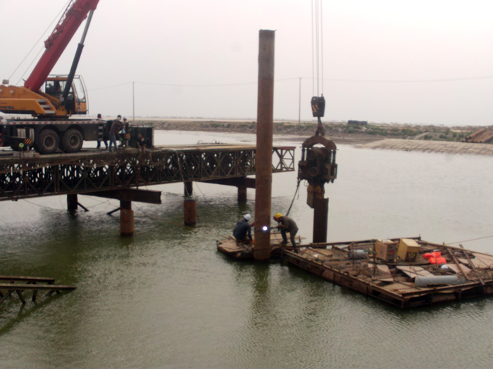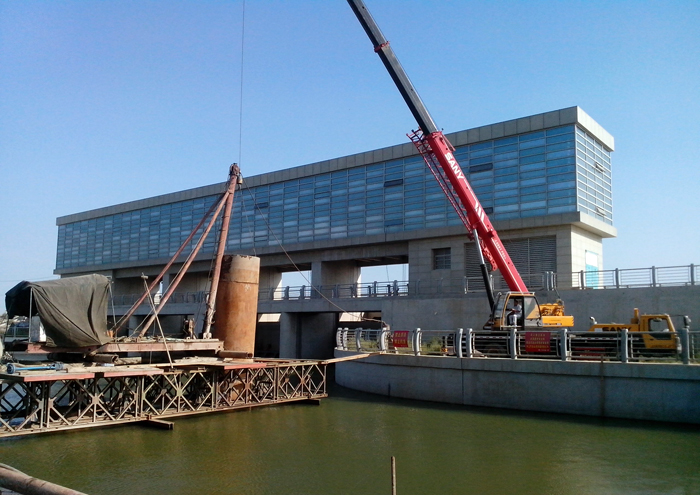 而全橋36根40多米深的鉆孔灌注樁施工因其地質復雜多變、未知因素多,成為施工第一難點和焦點,尤其是地處河道深水區的12個橋墩的灌注樁施工更是異常艱難。同時新城閘還是連云新城地區唯一能在汛期發揮城市防汛排澇的水閘,汛期必須保證正常運行。項目部根據施工現場地質條件,經過多個方案比選,最終采用了搭建水上平臺施工方案,在河道上搭設鋼便橋進行鉆孔,保證新城閘在汛期也能正常運行。由于地質條件復雜多變,再加上特殊的施工環境造成的護筒內外的特殊壓力差,因此,必須抓好施工過程控制,及時處理特殊事件,以確保工程順利進行。當進行到最后一個橋墩灌注樁作業時,成孔作業在水下30多米深發生了塌孔現象,錘頭被埋在下面。盡管項目部想盡了辦法,也沒能撈出錘頭。但時間不等人,項目部當機立斷,放棄錘頭打撈,重新購置了一只價值6萬多的錘頭繼續作業。