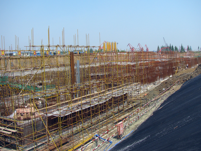 在勞模團隊的帶領下,新溝河江邊樞紐工程迎來了第二個重要工程節點:上、下閘首及閘室共14塊底板混凝土全部澆筑完成,進入船閘上部結構施工階段。截止
