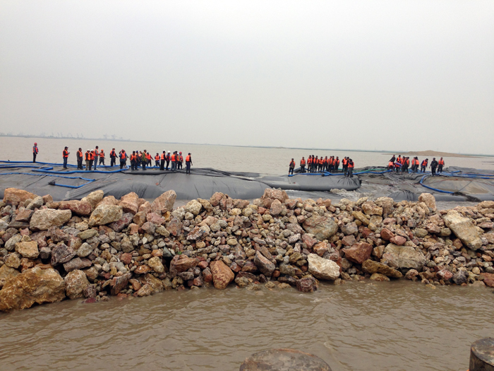 該工程自2013年12月19日開工以來,在常熟市政府的統(tǒng)一組織下,在業(yè)主、項(xiàng)目總承方、監(jiān)理方及社會(huì)各界的大力支持和協(xié)調(diào)下,項(xiàng)目部克服水上作業(yè)活動(dòng)多、安全要求高、航道吃水深度不足、施工強(qiáng)度大、采砂難、運(yùn)距遠(yuǎn)、趕潮施工等諸多不利因素,分公司副經(jīng)理、項(xiàng)目經(jīng)理高桂章帶領(lǐng)施工項(xiàng)目團(tuán)隊(duì)攻堅(jiān)克難,精心組織,優(yōu)化方案,狠抓細(xì)節(jié)落實(shí)和安全管理。合龍時(shí)分公司領(lǐng)導(dǎo)葛年平、吳寶華現(xiàn)場(chǎng)指導(dǎo),順利完成了龍口合龍。合龍后項(xiàng)目部繼續(xù)24小時(shí)不停機(jī)對(duì)龍口斷面加高培厚,確保龍口安全。