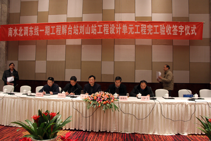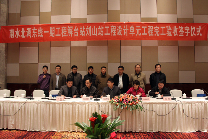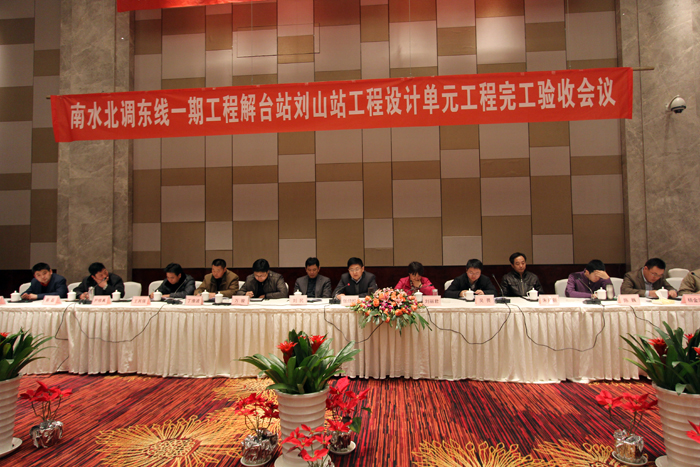 20121218~19日,江蘇省南水北調辦公室受國務院南水北調辦公室委托在徐州市組織了南水北調東線一期工程解臺站劉山站工程設計單元工程完工驗收,我公司承建的解臺站設計單元工程順利通過完工驗收。省南辦張勁松副主任、劉麗君處長、省水源公司副總經理劉軍及國調辦、淮委、省水利廳、省水源公司、質量監督、建設、設計、施工等單位領導專家出席會議,公司副總經理許國安參加了驗收活動。