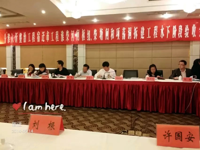 5月14日, 淮河水利委員會、江蘇省水利廳在宿遷沭陽縣聯合組織召開了分淮入沂整治工程宿遷市淮柴河閘樞紐、柴塘閘和項蕩洞拆建工程水下階段驗收會議。水利部淮河水利委員會、江蘇省防汛防旱指揮部辦公室、省水利工程建設局、省水利工程質量監督中心站、省分淮入沂整治工程建設管理局以及工程建設、設計、施工、監理、檢測等單位的專家及代表參加了驗收會議。我公司副總經理許國安參加了驗收活動。