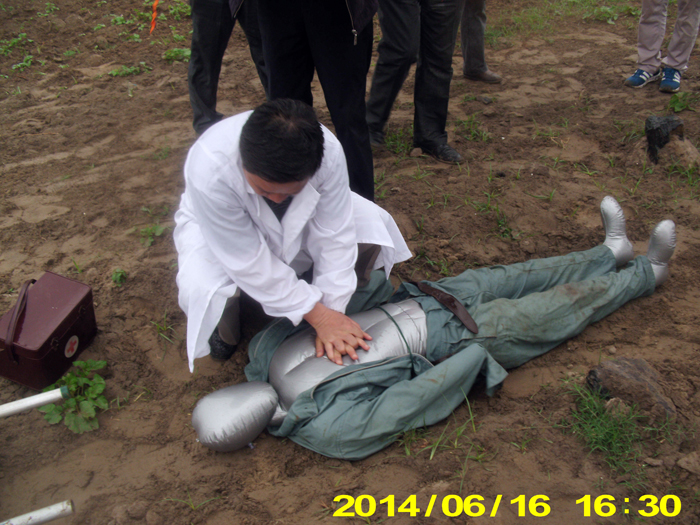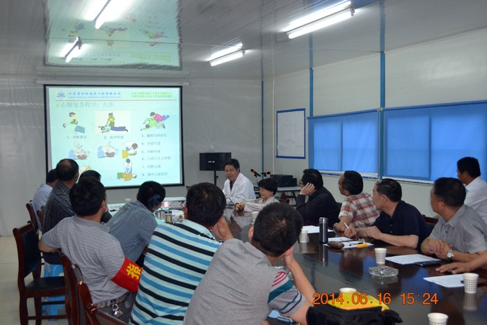 演練開始前,在項目部會議室進行了應急救援知識的培訓。分公司安全科長朱躍南向參演人員講述了溺水救護的有關知識,然后由具備職業資格的主治醫師劉東從專業角度講解了如何進行搶救和救治落水者。
