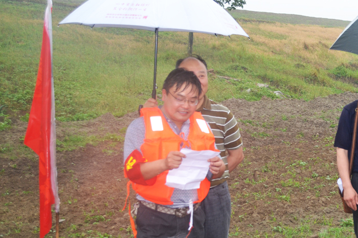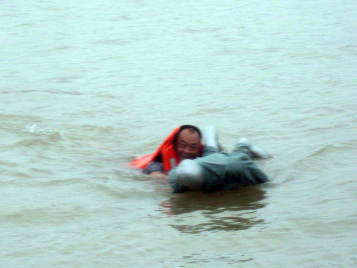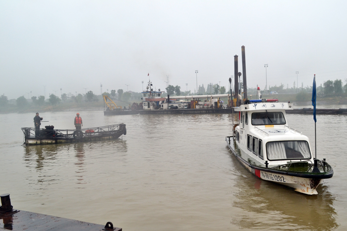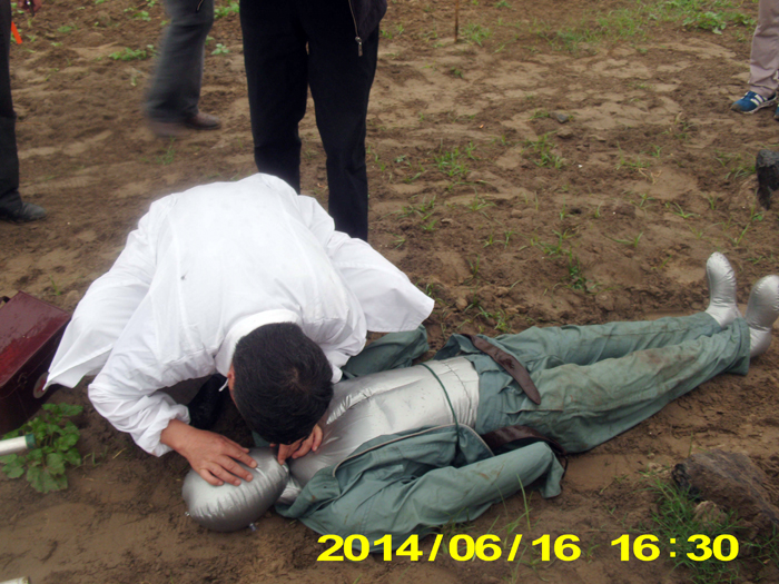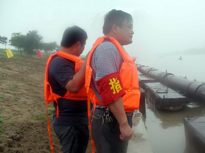 下午4時許,總指揮葛年平宣布實戰演練開始,各參演人員立即投入到了人員溺水應急救援活動中。現場“蘇水大禹號”疏浚船正在引江河內施工,這時船員馬樹軍發現有人落水并大聲呼救:“有人落水”,“蘇水大禹號”主任陳金國、副主任濮玉強聞聲立即趕往落水者附近,同時陳金國電話向項目經理報告。總指揮葛年平接報后,立即啟動應急救援機制,帶領項目部各救援組冒雨趕往現場。安全科長徐聚朋立即向海事部門求援,請求海事艇進行封航。同時,副指揮閆武軍撥打“120”請求救護。這時應急救援小組人員已抵達現場后開展救援工作。救生艇迅速靠近落水者,水性較好的吳明福跳入水中救援落水者,在救生艇的保護下將落水者救出水面帶至岸邊,其后用擔架抬至空曠地點,使溺水人員仰臥于平坦位置。劉東醫師采用人工呼吸和心肺復蘇方法對落水者了急救。在經過緊急搶救后,溺水人員得以蘇醒,救援人員對溺水人員作了妥善安置。