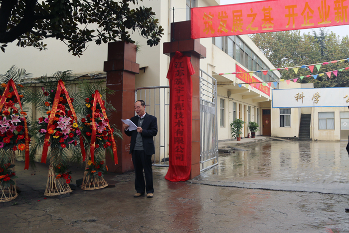 10時許,綿綿細雨浸潤下的綠陰顯得格外蔥籠清新,筑宇公司大門前彩旗招展,鮮花綻放。在筑宇公司董事長章根興的主持下,大家排列整齊、滿懷喜悅地見證揭牌時刻的到來。公司董事長夏國春和筑宇公司經理常錦亮共同揭開紅綢,標志著這個集勘探、設計、檢測、實驗于一體的新公司揚帆起航,開啟發展的新宇天地。