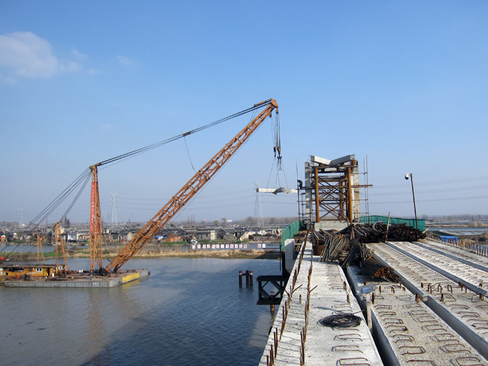 董潭生產橋是南水北調泰州市鹵汀河拓浚跨河橋梁工程兩座中的其中之一,全長348.3米,接線長707.021米,主跨為85米桁架梁,兩側引橋為13孔20米的先張預應力空心板梁。