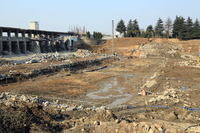 下午,公司朱學林董事長、建設處丁淮波主任、監理處王國強總監等一行,在駐守該工程的常務副總經理時愛祥、項目經理李新海的陪同下,仔細察看了工程現場,慰問了正在上班的一線工人,并召開了一個簡短的碰頭會,就工地目前存在的情況交換了意見。自1月14日項目先遣人員到工地現場以來,20多天時間已完成閘塘抽水,開始老閘拆除和基坑降排水,并利用一組廢舊的化工廠廠房,建起了臨時生活和辦公用房。在項目部的春節生產計劃中,一個“急”字讓這個春節搶工變得格外的沉重——原本采取降水措施后即開始機械開挖基坑,因地下水極為豐富,不得不暫時中斷施工,等待具備條件才能進行土方開挖。而這又使本已極為緊迫的工期比原節點計劃滯后10多天。春節前項目部邀請公司多位專家反復商量,苦思良策。針對這種情況,項目部將“慢性病”當作“急病”醫,始終立足一個“搶”字:正月初二繼續在圍繞基坑一圈的輕型井點內側再施打一圈輕型井點;正月初四開始沖土作業,降水與水力沖土雙管齊下,咬定目標,搶抓時間,加班加點,全力推進,一點點地破解難題。