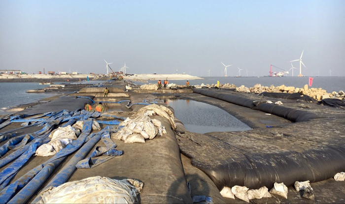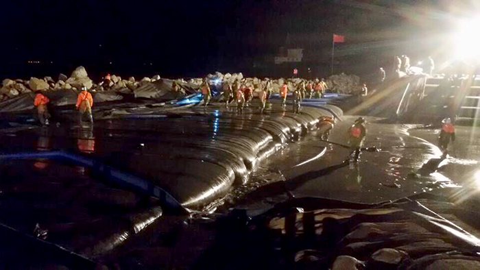 項(xiàng)目部在業(yè)主、監(jiān)理單位和一分公司劉埠閘項(xiàng)目部的大力支持下,克服砂源質(zhì)量不高、排距遠(yuǎn)、土工織物設(shè)計(jì)指標(biāo)偏高、水上作業(yè)活動(dòng)多、趕潮施工、圍區(qū)較大合龍困難等諸多不利因素的影響,優(yōu)化方案,精心組織,攻堅(jiān)克難,戰(zhàn)勝了龍口收縮期和合龍期的多次險(xiǎn)情,經(jīng)過四天晝夜不停的拋石截流,袋裝砂吹填施工,最終取得了合龍勝利,按合同要求實(shí)現(xiàn)了本工程第一個(gè)節(jié)點(diǎn)工期。這是建國以來如東縣第二十五次圍堤合龍當(dāng)中龍口水面最深,灘面最廣,并實(shí)現(xiàn)一次性成功合龍的圍堤工程。