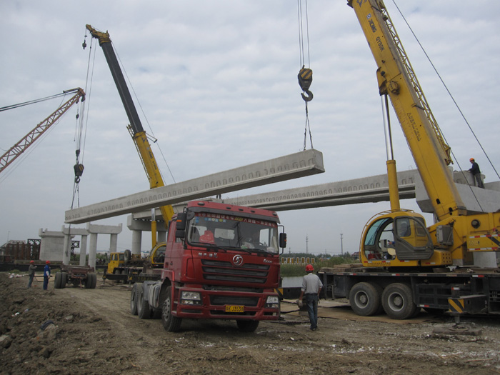 混凝土預(yù)制箱(板)梁結(jié)構(gòu)形式中小跨徑橋梁應(yīng)用較為廣泛,公司常在各水利樞紐工程的工作橋或交通橋中應(yīng)用此結(jié)構(gòu)。根據(jù)梁板安裝方法不同,分為汽車吊陸域安裝、浮吊船水上安裝、貝雷架安裝及架橋機(jī)安裝等。