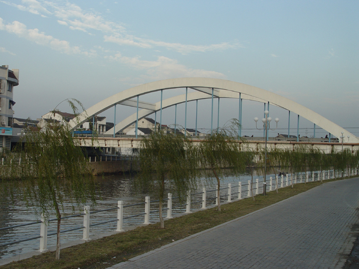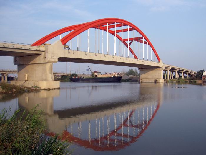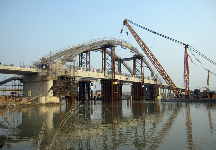 常熟常滸河拓浚梅李大橋?yàn)轭A(yù)制混凝土拱肋系桿拱橋,主跨