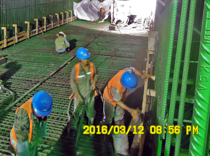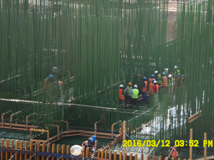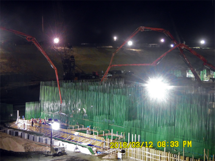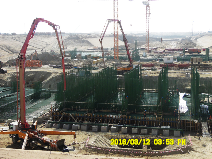 當地時間3月12日下午5時許,泵站第一塊底板(2#底板)開倉澆筑。此塊底板混凝土1300余方,鋼筋450多噸,插筋高度(直徑28的螺紋筋)8米。經過兩天極為苛刻的質量驗收才獲得通過。澆筑過程中,因振搗而濺到插筋上面的漿液都要逐根及時清洗,以保證后續澆筑的混凝土對鋼筋有良好裹握。