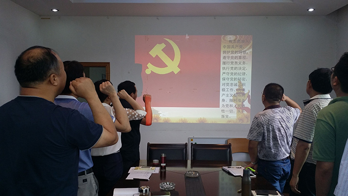 會議由支部書記王建平同志主持。大家學習了《黨章》的總綱部分,重溫入黨誓詞并集體宣誓,學習了習近平總書記在慶祝建黨95周年大會上的講話,并就“兩學一做”的具體內容和要求進行了深入討論、交流。支部全體黨員上了一堂生動、全面的黨課。