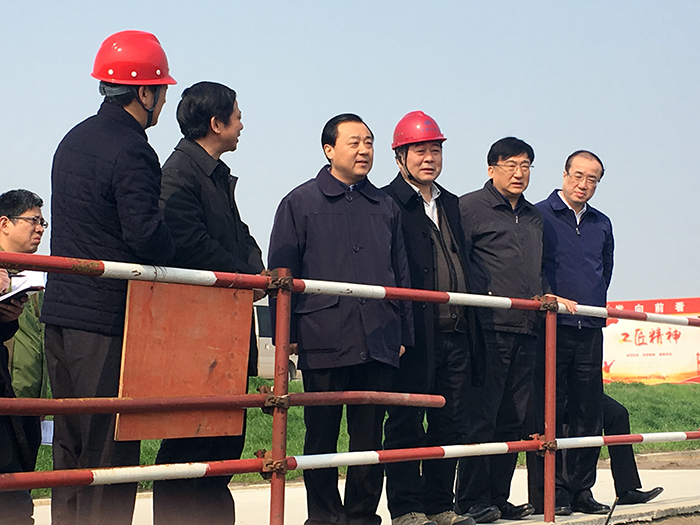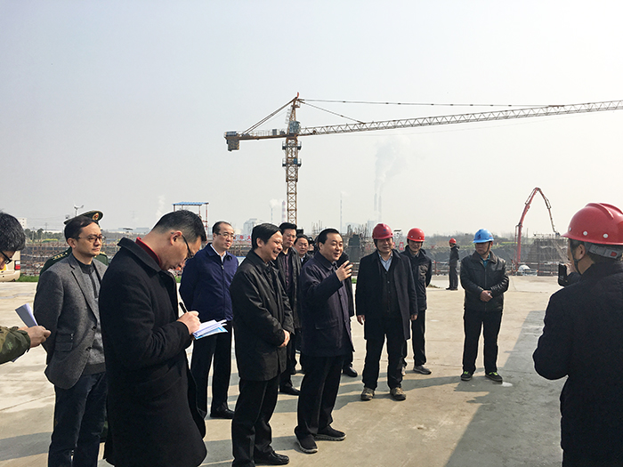 22日上午,早春的陽光和煦明媚,工地上處處生機盎然。謝正義一行來到泵站施工現場旁的大平臺上,聽取工程規劃和建設情況介紹,了解工程施工組織情況,并仔細察看了施工現場。