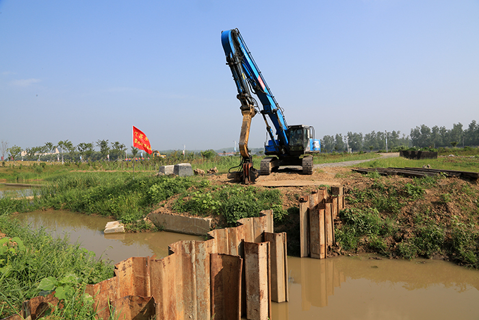 洶涌的水流沖破堤壩直泄而來,雖然是演習預設場景,但水流的沖擊力不亞于真實的決堤搶險。公司的隊員立即行動起來,植樁機拉起鋼板樁,隨著一陣陣錘擊聲,鋼板樁迅速插向決口,決口逐漸縮小。十多分鐘后,一道堅固的鋼板樁圍堰攔阻住了肆虐的水流,決口封堵取得了圓滿的成功。