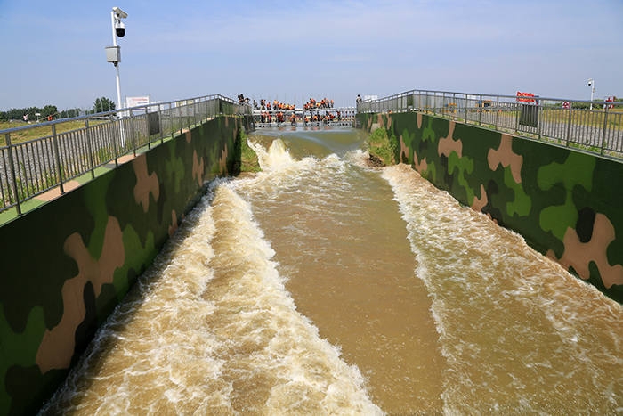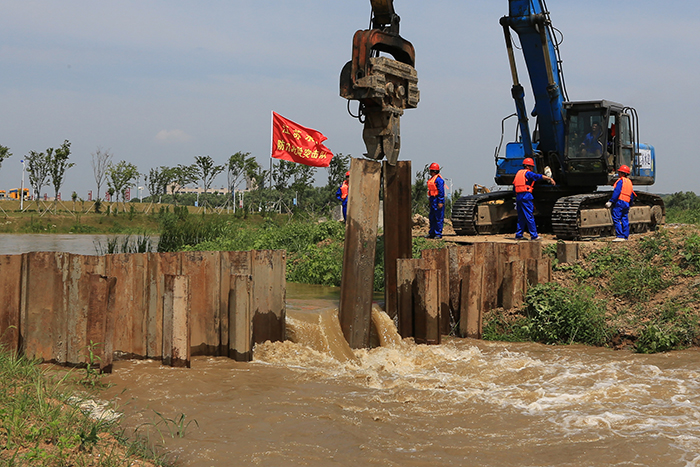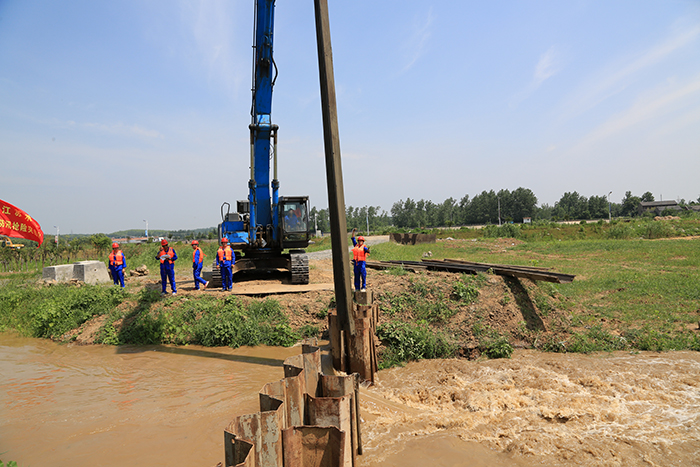9時50分,指揮部接報,下游發生潰壩險情,指揮部立即下令搭建鋼木石土石壩封堵決口,同時命令江蘇水建防汛搶險突擊隊立即開展大型鋼板樁植樁封堵作業。
