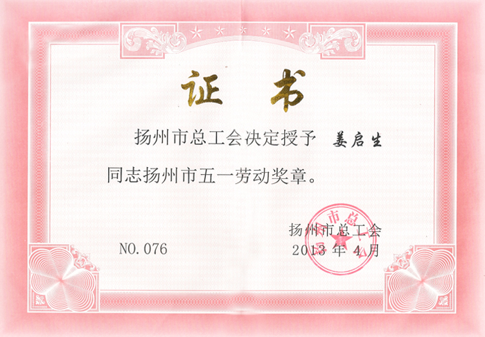 426下午,揚州市慶“五一”建功立業表彰大會上又傳來喜訊,我公司工會主席姜啟生被授予“揚州市五一勞動獎章”榮譽稱號,表彰了他在創新工作方式、推進工會建設、促進公司發展等方面作出的積極貢獻。