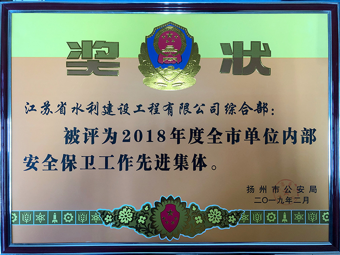 近日,公司綜合管理部被揚(yáng)州市公安局評(píng)為“2018年度全市單位內(nèi)部安全保衛(wèi)工作先進(jìn)集體”榮譽(yù)稱(chēng)號(hào)。