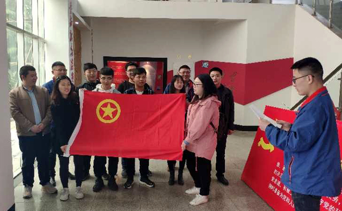 下午,團員青年參觀了江都郭村保衛戰紀念館,觀看了郭村抗戰時期的圖片、展物,聽取了英雄事跡介紹,并面對團旗,在莊嚴的團歌聲中重溫了入團誓詞。通過看、聽、悟的形式,團員青年們感受了抗戰期間先烈們的民族精神,接受了“沉浸式”的精神洗禮。