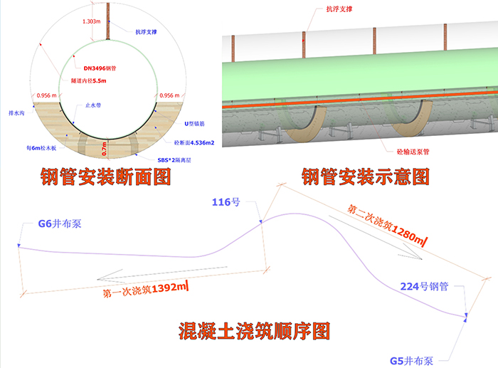 該工程系杭州供水管道G5-G6隧道區間2672米的鋼管制作、防腐、安裝、管座混凝土澆筑等綜合工程。隧道內徑5.5米,埋深1315米,隧道內置一根DN3496供水鋼管,鋼管制作運輸長度定為12米(單根重量31噸),本區間共計224根鋼管,鋼管管座填充混凝土約1.4萬方。