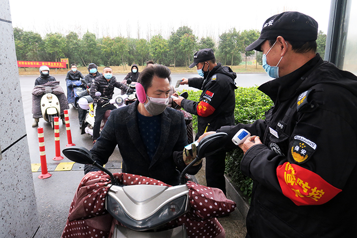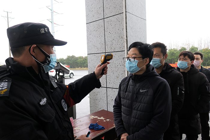 2月14日清晨7時30分,濃濃的霧氣尚未散去,江蘇水利機械制造公司的員工已經戴著口罩在大門口列隊,測量體溫,登記卡片,陸續進入廠區,開始了一天緊張的工作。