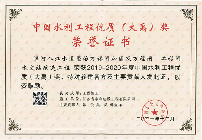 • 2021-2022中國水利工程優質(大禹)獎(南水北調東線一期工程洪澤站工程)